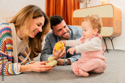 Joyful family playing together with toys, engaging their adorable baby in delightful activities for cognitive and emotional development in a warm and loving environment