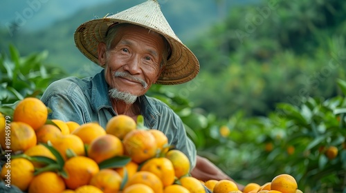 Joyful farmer in Southeast Asia picking fruits in an orchard surrounded by nature's beauty capturing the joy of a bountiful harvest realistic photo, high resolution , Minimalism,
