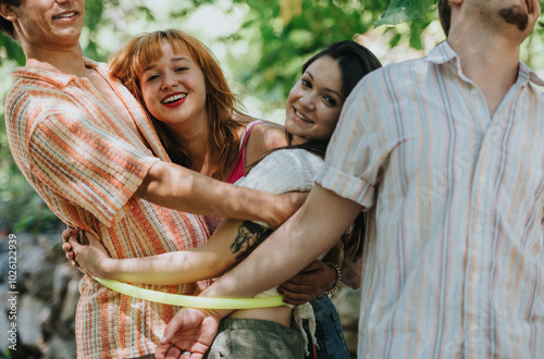 Joyful friends embracing and enjoying the outdoors together in a natural setting. The image captures happiness and friendship among young people in a sunny environment.