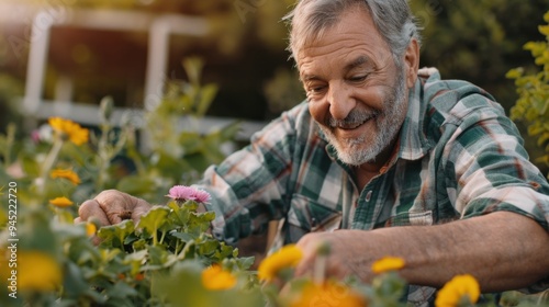 Joyful Gardening: With a cheerful smile, a man plants vibrant flowers in his garden, his happiness reflecting the joy of nurturing life and the beauty of the natural environment.