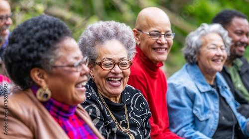 senior, friends, laughing, gathering, joy, connection, happiness, diverse, group, smile, positivity, natural light, warmth, park, greenery, sunlight, casual attire, relaxed, informal, community, bond, optimism, multicultural, cheerful, candid, togetherness, companionship, enjoyment, amusement, leisure, vibrant, elderly, fun, emotion, shared, life events, garden, radiant, well-being, aged, lifestyle, camaraderie
