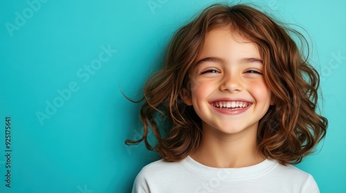 Joyful girl with wavy hair and a wide smile, wearing a striped shirt, laughing against a turquoise wall.
