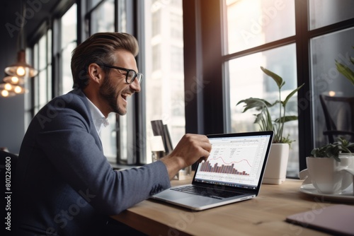 Joyful man in smart casual outfit using laptop, displaying graphs, laughing in modern office with daylight and plants. Ideal for themes of success, business analytics, and workplace enthusiasm