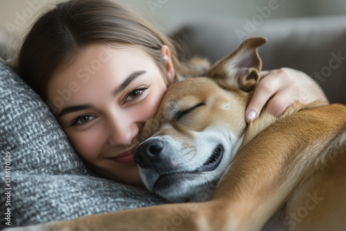 woman, dog, couch, cuddling, happiness, companionship, cosy, love, fur, pet, relaxation, interior, evening, smile, bonding, comfort, warmth, joy, cute, canino, affection, family, care, leisure, home, lifestyle, moment, calmness, resting, friendship, furry, friends, together, snuggling, hugs, animal, personality, vibe, connection, soft