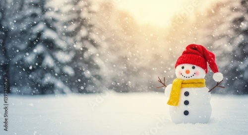 Joyful Snowman in Winter Wonderland - Adorable snowman in a red hat and yellow scarf, standing in a snowy winter scene with falling snow and pine trees in the background