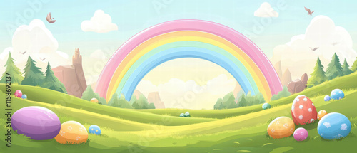 spring, landscape, rainbow, easter, egg, colourful, field, cartoon, illustration, nature, vibrant, scenery, celebration, holiday, flora, fauna, sunny, sky, grass, hill, decoration, joy, festive, serene, playful, pastel, cheerful, scenic, bright, tradition, gathering, childhood, fun, scene, fresh, blooming, beauty, idylli, whimsical, creative, art, vector, greenery, relaxation, happiness, seasonal, magical, day