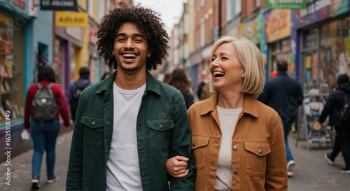 Joyful Stroll Through Urban Street: A heartwarming moment captured of two individuals, arm in arm, laughing and walking along a vibrant, colorful street, full of life and joy.