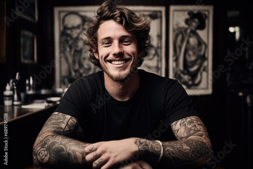 Joyful Tattoo Craftsman: Captured in a candid moment, a male tattoo artist's joyous expression captures the essence of his craft within the tattoo parlor's ambiance