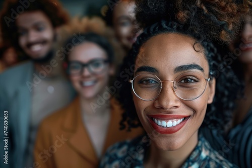 Joyful team of colleagues in office setting radiating happiness and togetherness group of young men and women including businessmen and businesswomen sharing moment of laughter and enjoyment
