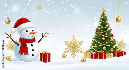 snowman, christmas, tree, winter, snow, holiday, festive, decoration, ornament, gift, present, happy, cheerful, smiling, joyful, red, green, white, gold, gold, snowflake, star, background, illustration, vector, design, art, graphic, card, greeting, banner, landscape, scene, season, celebration, merry, christmas, new year, magic, whimsical, cute, cartoon, santa, hat, foulard, falling, bright, cold