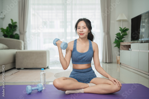 woman, home, fitness, exercise, yoga, mat, dumbbell, physical exercise, healthy, lifestyle, sitting, smiling, indoor, relaxation, training, activity, well-being, sport, motivation, strength, balance, physical, health, energy, harmony, wellness, calm, routine, personal, space, sharpened, determined, casual attire, equipment, leisure, contemporary, modern, positive, athletic, casual clothes, weight, stretch, control, peace, asian, asia