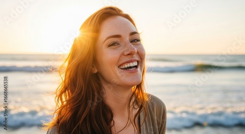 woman, laughing, beach, sunset, ocean, happy, redhead, smile, wave, sun, girl, portrait, summer, beautiful, joyful, carefree, relax, freedom, happiness, nature, model, young, pretty, female, person, sea, coast, light, gold, horizon, travel, vacation, holiday, lifestyle, healthy, energy, fun, positive, vibrant, expression, beauty, well-being, people