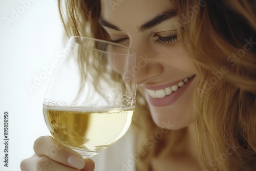 Joyful Woman Smiling While Holding a Glass of Wine Capturing a Relaxing Moment, Radiating Warmth and Happiness in a Soft Light Setting