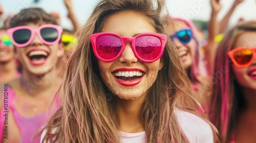 Joyful young people celebrating at an outdoor festival with colorful sunglasses and vibrant hairstyles, expressing happiness and excitement in a lively atmosphere