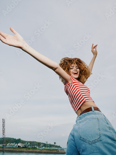 joyful, woman, outdoors, sky, expression, freedom, energy, happiness, smile, carefree, fashion, style, striped, top, red, white, denim, jean, movement, jump, leap, arm, stretch, pose, casual attire, sunlight, summer, portrait, lifestyle, camera, shoot, model, photo, cheerful, dynamic, vibrant, colours, palette, trend, upbeat, positive, nature, landscape, breeze, wind, open, space