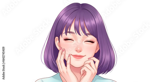 Joyful young woman with purple hair smiling warmly, touching her face with delicate hands