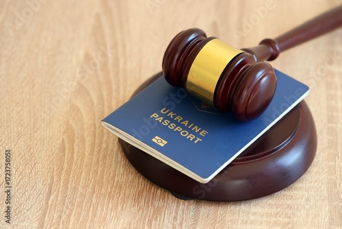 Judge hammer and ukrainian passport on brown background. Passport Of Ukraine