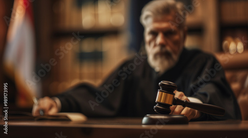 Judge in courtroom holding gavel, displaying authoritative presence amidst legal documents and flag backdrop, capturing decisive judicial role and courtroom environment.