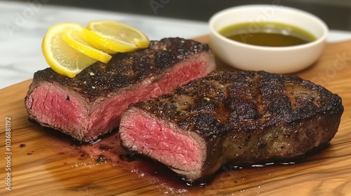 steak, beef, grilled, meat, epicure, cookery, italian, food, dinner, lunch, slice, tender, juicy, lemon, plate, wood, cooking, eatery, chef, meal, protein, fresh, favor, delicious, garnish, vibrant, serving, healthy, closeup, kitchen, culinary, premium, traditional, bar-b-q, rustic, appetising, texture, cut, fine, presentation, seared, quality, savour, showcase