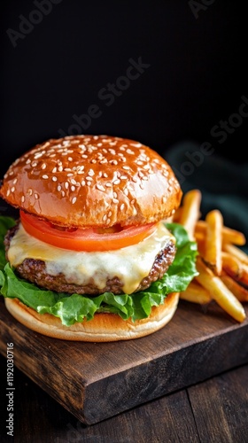 cheeseburger, burger, hamburger, fries, french fries, lettuce, tomatoes, fast food, delicious, appetising, tasty, food photography, wooden board, rustic, dark background, closeup, high-quality, comfort food, dinner, lunch, meal, side dish, snack