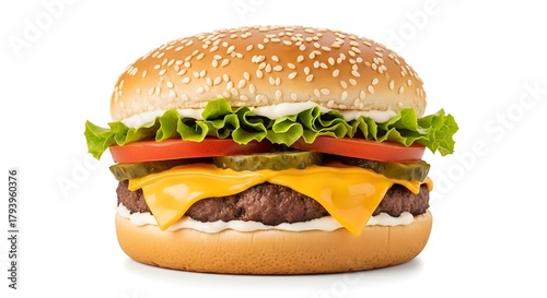 cheeseburger, burger, hamburger, fast food, food photography, delicious, appetising, meal, sandwich, meat, cheese, cheddar, lettuce, tomatoes, pickle, bun, sesame seeds, epicure, junk food, snack, lunch, dinner, take-away, eatery, epicure, comfort food, closeup, hi-res, savoury