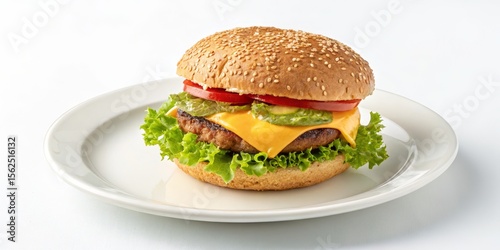 cheeseburger, burger, delicious, juicy, food, plate, closeup, studio, shot, photo, fast food, meat, beef, cheese, bun, lettuce, tomatoes, onion, pickle, sesame, patty, greasy, tasty, appetising, epicure, dinner, lunch, meal, eatery, cafes, snack, american, classic, traditional, fresh, gold, brown, crispy, mouth-watering, savoury, rich, satisfying, protein, culinary, gastronomy, eating