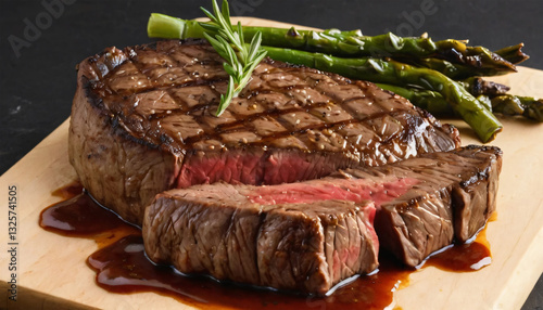 Juicy Crosshatch-Grilled Medium-Rare Steak with Rosemary and Grilled Asparagus on Wooden Cutting Board – Rustic Gourmet Cooking, Food Styling, or Meat Lovers' Blog Content