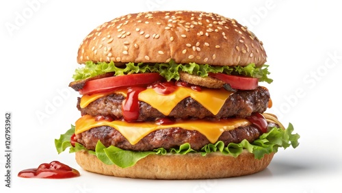 Juicy Double Cheeseburger with Ketchup, Isolated on White Background, Fast Food, Burger ,burger,cheeseburger