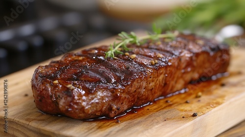 Juicy grilled steak garnished with herbs on a wooden board in a cozy kitchen setting. Generative AI
