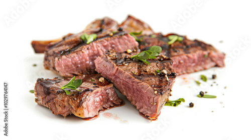 Juicy grilled steak pieces garnished with fresh herbs, showcasing perfect sear and rich color. Ideal for food lovers and culinary enthusiasts