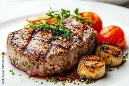 Juicy grilled steak with seared scallops and fresh cherry tomatoes garnished with herbs on a white plate for a delicious gourmet seafood and steak dish presentation