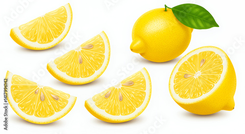 Juicy Lemon Slices and Whole Lemon Fruit Vibrant Yellow Citrus Refreshing Summer Fruit