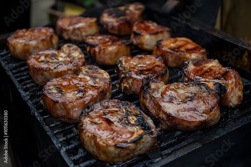 juicy steak of meat on grill, beef and pork cooking on the barbecue outdoor