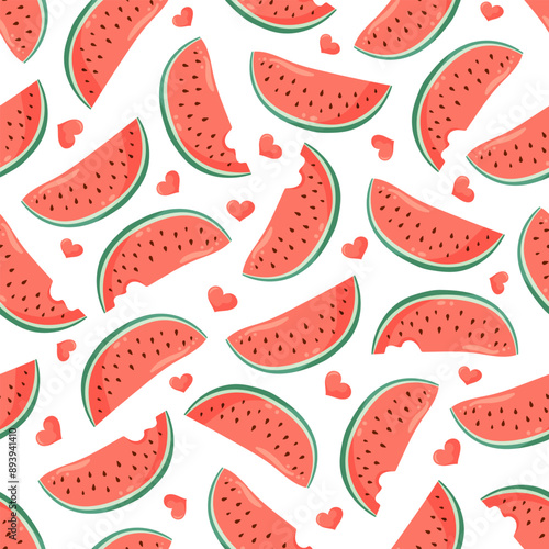 Juicy watermelon slices with small hearts seamless pattern. Summer fruit vector illustration. Tropical fruit background for Valentines day, baby fabric, kids textile, packaging, wrapping, scrapbook