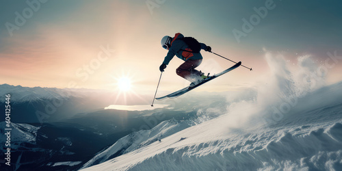 Jumping skier is skiing on the slopes of the mountains. Extreme winter sports in the mountains. Generative AI