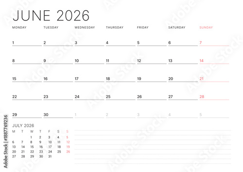 June 2026 calendar planner template. Week starts on Monday. Simple and modern design for effective scheduling and planning. Vector illustration for a printable business agenda page