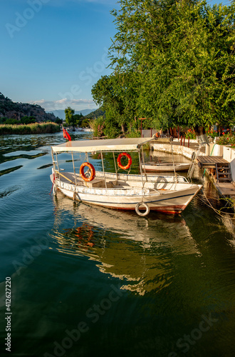 June13, 2020. Dalyan, Mugla - Turkey. Boats view at slope of Lycians rock tombs in Dalyan Town.