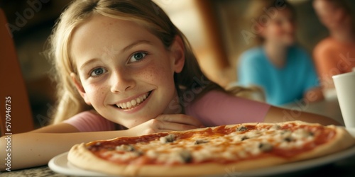 Junges Mädchen im Pizza Restaurant lächelt beim Pizza essen, ai generativ