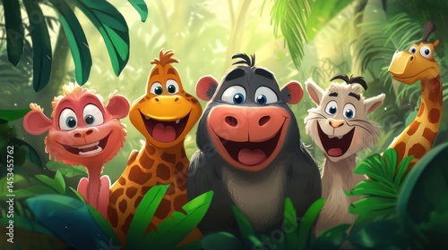 animal, jungle, forest, happy, friendly, cute, cartoon, illustration, wildlife, nature, mammal, giraffe, monkey, chimpanzee, hippo, cat, mammal, park, adorable, fun, bright, colourful, vibrant, lush, tropical, green, leaf, plant, smiling, design, digital, art, creative, character, drawing, playful, graphic, image