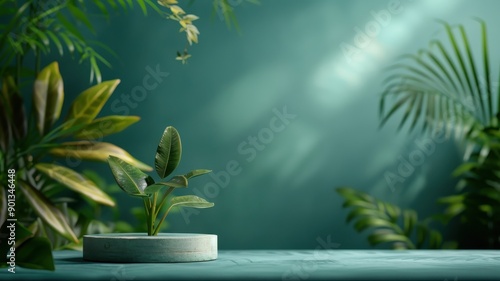 Jungle-themed stage with a green wooden pedestal for a product, surrounded by a lush garden of tropical plants and a tranquil setting.