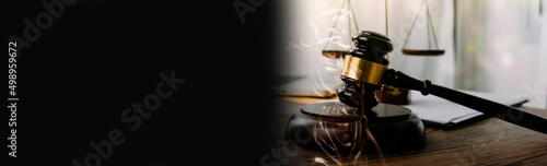 justice and law concept.Male judge in a courtroom on wooden table and Counselor or Male lawyer working in office. Legal law, advice and justice concept.