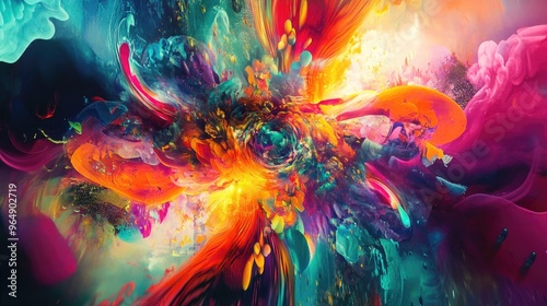 Kaleidoscope-inspired digital artwork with vibrant color explosions, swirling abstract elements, and futuristic geometric shapes