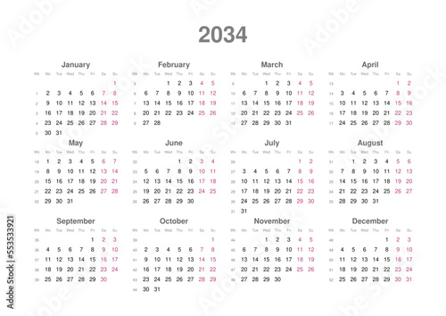 calendar, 2034, english, calendar, annual, monday, tuesday, wednesday, th, friday, sat, sat, sunday, year, year, yearly, month, daytime, day, planning, organiser, organiser, week, week, agenda, diary, time, business, jan, february, march, april, may, june, july, august, september, october, november, december, red, vector, summary, horizontal format