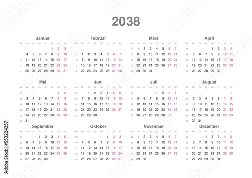 calendar, 2038, german, calendar, annual, monday, tuesday, wednesday, th, friday, sat, sat, sunday, year, year, yearly, month, daytime, day, planning, organiser, organiser, week, week, agenda, diary, time, business, jan, february, march, april, may, june, july, august, september, october, november, december, red, vector, summary, horizontal format