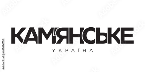 Kamianske in the Ukraine emblem. The design features a geometric style, vector illustration with bold typography in a modern font. The graphic slogan lettering.