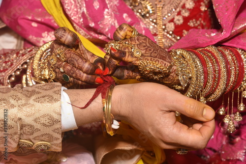 Kangna Ceremony during Indian Wedding. Bride tying knots during the wedding ceremony