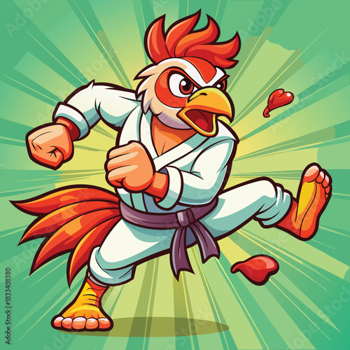 rooster, chicken, karate, martial, art, fighting, kick, action, cartoon, illustration, character, animal, bird, gi, belt, purple, white, dynamic, fierce, aggressive, sport, training, combat, funny, cute, energetic, movement, attack, defense, game