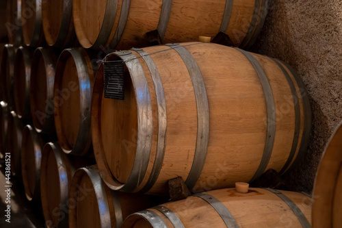 Keeping for years of dry red wine in new oak barrels in caves in Burgundy, made from pinot noir grape
