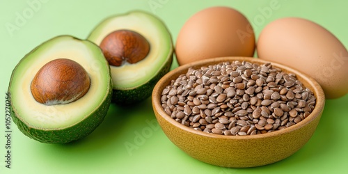 healthy eating, health food, diet, nourishment, healthy lifestyle, weight loss, wellness, avocado, egg, flaxseed, seed, green background, food photography, closeup, macro, protein, omega 3, low carb, fresh food, delicious, dietary, macrobiotic, organic, natural, healthy, wholesome, beautiful, tasty, high-quality