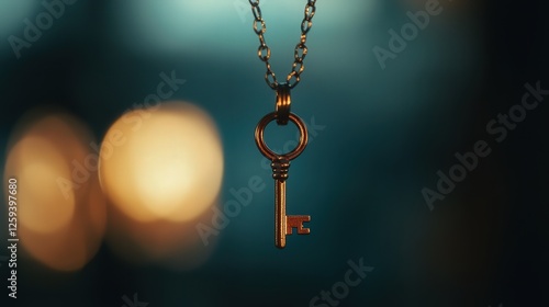 key pendant hanging from a neck, with the fine texture and subtle shine of the key standing out against the blurred background